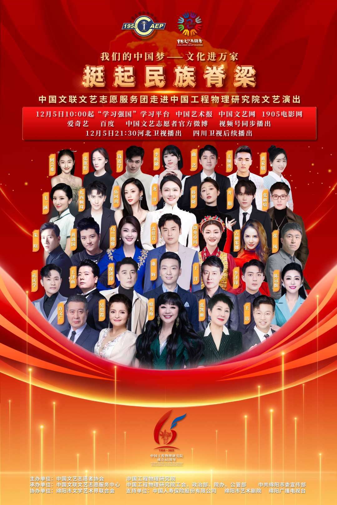 挺起民族脊梁——中国文联文艺志愿服务团走进中国工程物理研究院文艺演出将于12月5日10:00起上线播出为庆祝中国工程物理研究院成立65周年,弘扬“两弹一星”精神,由中国文艺志愿者协会、中国工程物理研究院主办;中国文联文艺志愿服务中心,中国工程物理研究院工会、政治部、院办、公管部,绵阳市委宣传部承办;绵阳市文联协办“挺起民族脊梁——中国文联文艺志愿服务团走进中国工程物理研究院文艺演出”将于第38个国际志愿者日,12月5日10:00起在“学习强国”学习平台、中国艺术报、中国文艺网、1905电影网、百度、爱奇艺、中国文艺志愿者官方微博、视频号等网络平台上线播出,12月5日21:30在河北卫视播出,四川卫视也将在后续播出,欢迎大家届时观看。本场演出紧紧围绕学习贯彻习近平文化思想,采用戏剧串联,原创了大量情景短剧,生动表现“两弹”元勋和科学家们的动人故事,在“送文化、种文化、传精神”中弘扬时代风尚。