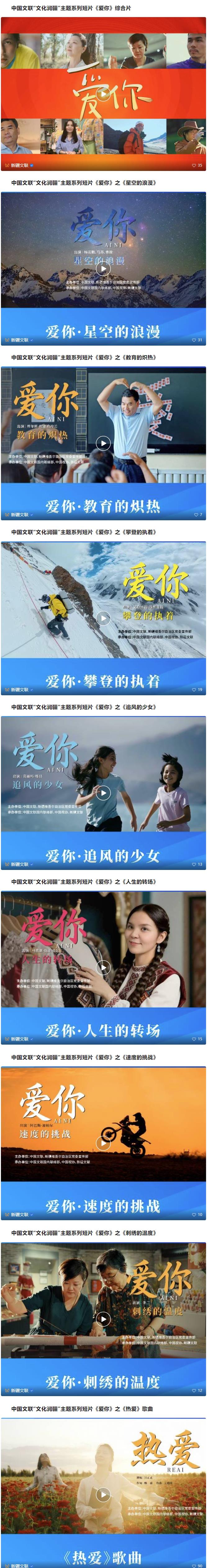 此次发布的《爱你》系列短片由8部作品构成。其中7部作品聚焦生活在新疆大地上不同身份的鲜活个体,1部作品为礼赞新疆各族人民的音乐MV,每部作品时长为4至5分钟。短片主人公来自多个民族、不同领域,有勇敢的攀登者、星空摄影师、服装设计师,也有可爱的足球少女、朴实的教育工作者、执着的赛车手、刺绣技艺传承人,共同勾勒出拼搏向上的新疆各族人物群像。