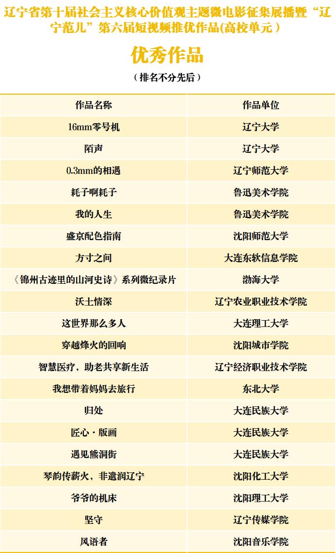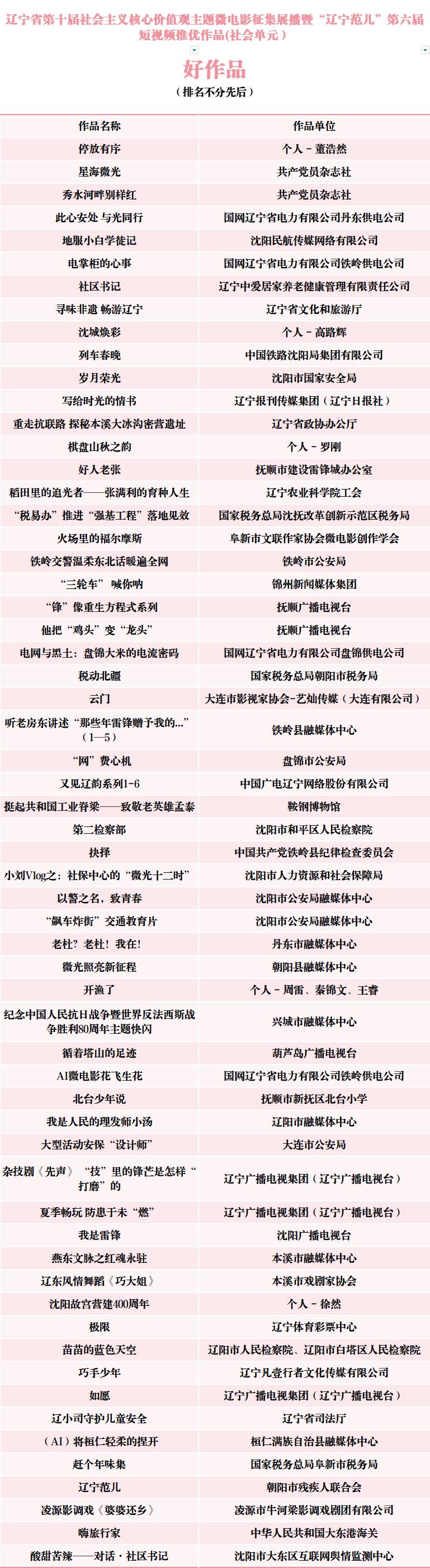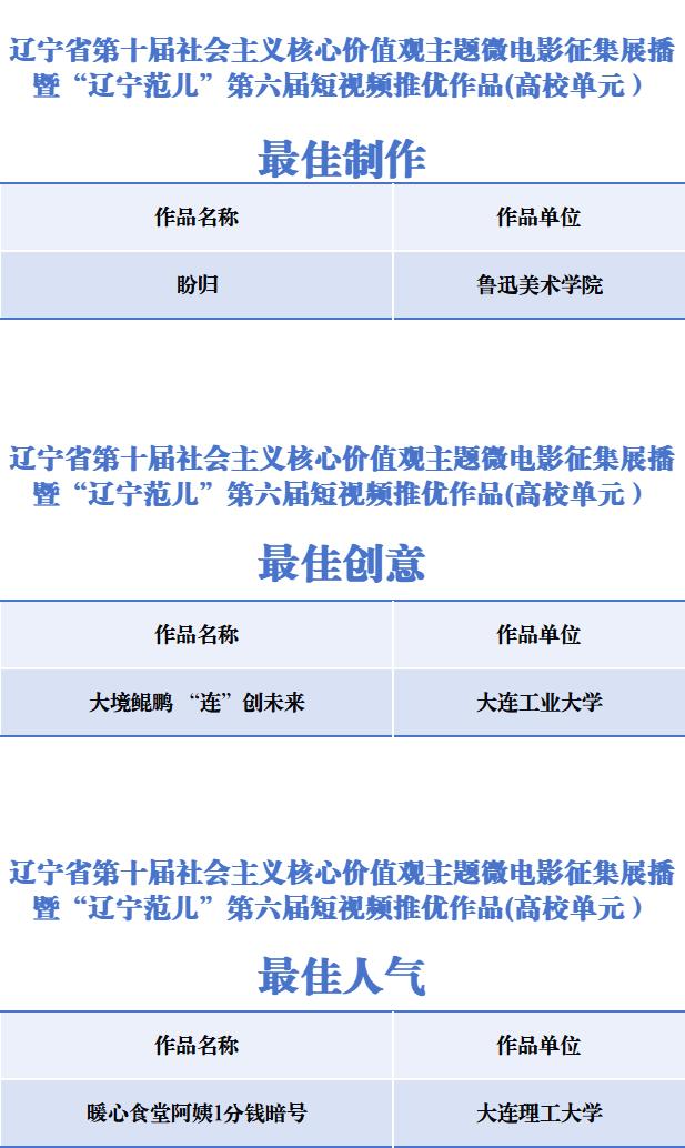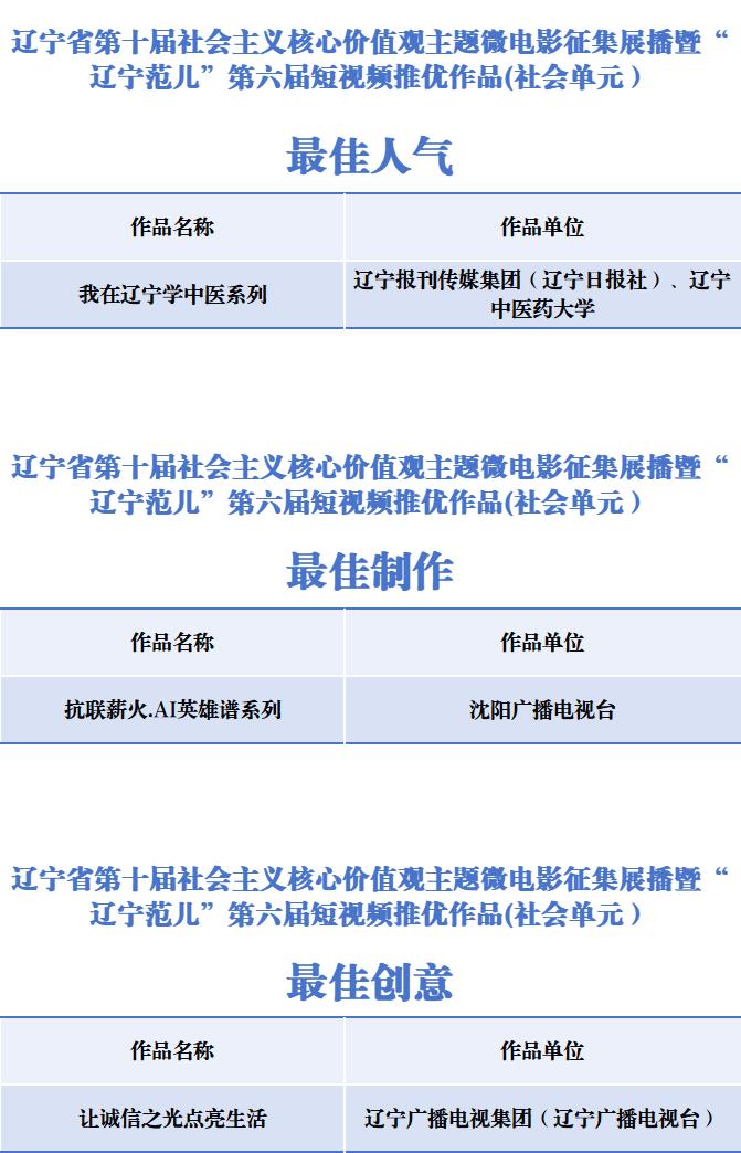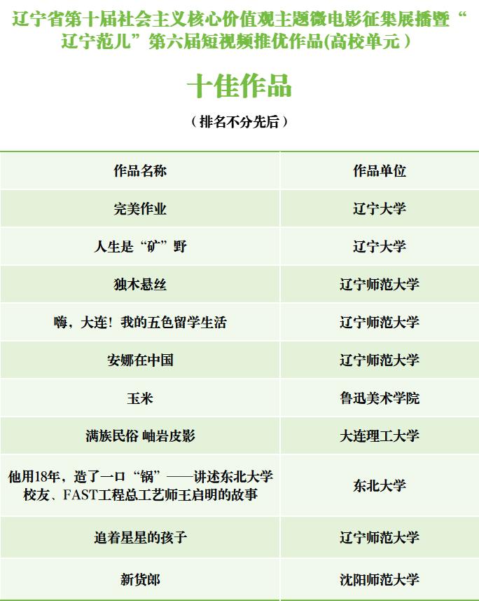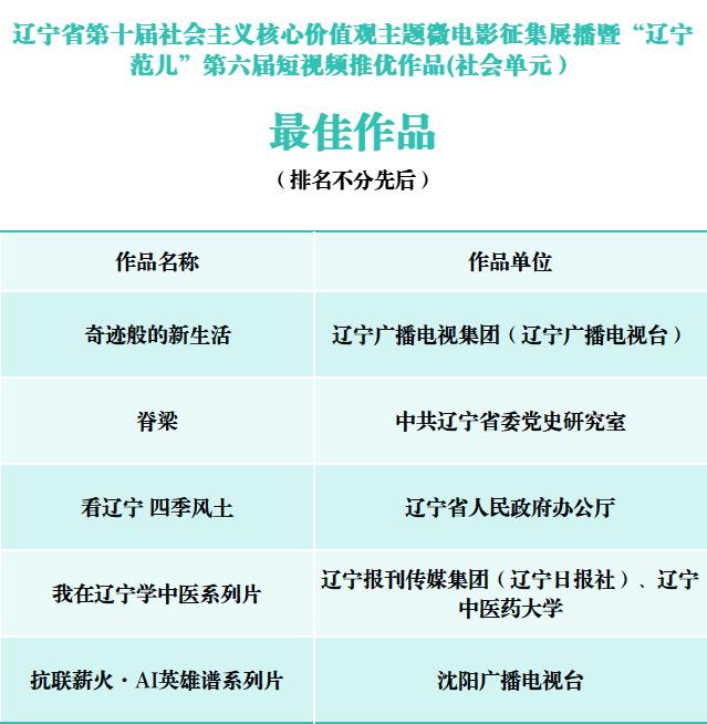 由辽宁省委宣传部、辽宁省文学艺术界联合会联合主办的辽宁省第十届社会主义核心价值观主题微电影征集展播暨“辽宁范儿”第六届短视频推优活动自2025年10月启动以来,全省各级融媒体中心、有关单位部门和各大高校、影视制作公司、产(行)业部门及影视爱好者踊跃报送作品,截止到11月上旬,共征集到作品1365部。经专家认真评审,最终推选出社会单元最佳作品5部、优秀作品10部、好作品60部,高校单元“十佳”作品10部、优秀作品20部,以及每个单元最佳创意、最佳制作、最佳人气单项荣誉6部作品。现将推选结果公示如下(名单不分先后)。