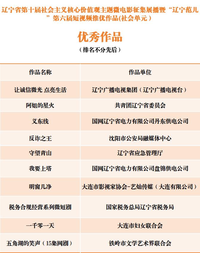 辽宁省第十届社会主义核心价值观主题微电影征集展播暨“辽宁范儿”第六届短视频推优作品评选结果