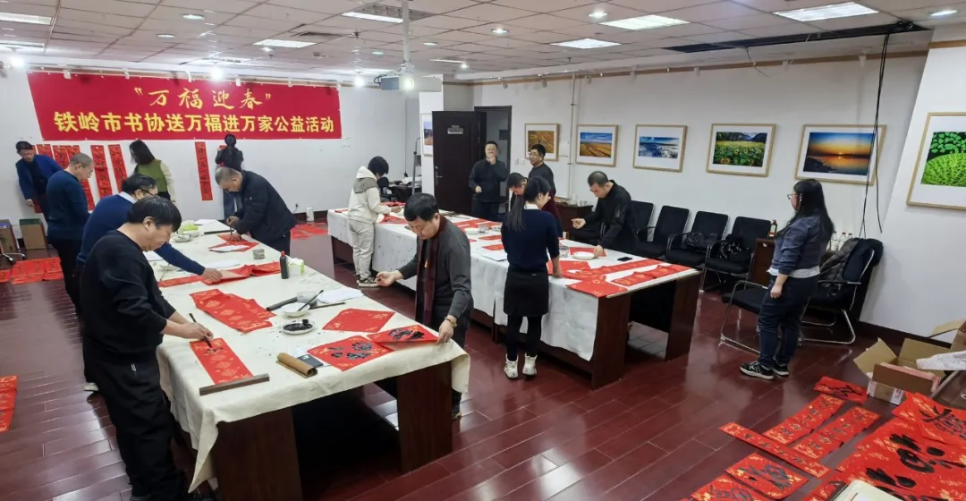 为深入学习贯彻习近平文化思想,弘扬中华优秀传统文化,营造欢乐祥和的节日氛围,近日,“挥毫送福进基层·墨韵飘香润机关”迎春笔会活动在铁岭市文联举办。铁岭市文联党组书记、主席刘延杰出席活动,市文联党组成员、副主席张兴仁、省书协副主席、市书协主席、市文联二级调研员王荐及机关全体干部与市书协主席团成员齐聚一堂,以笔墨传情,共迎新春。