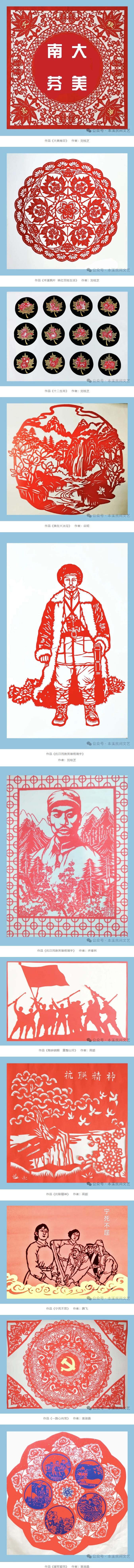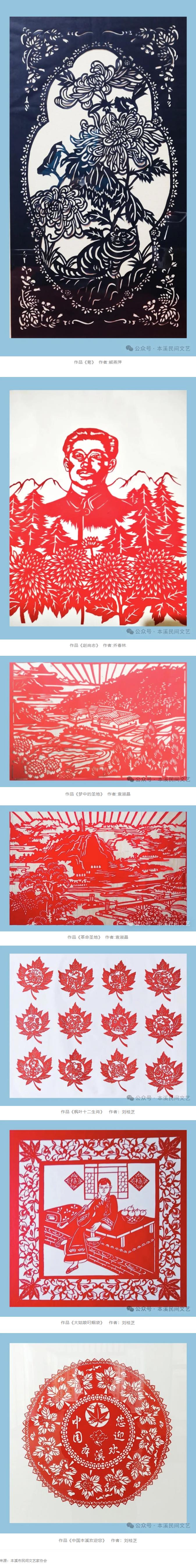 日前,由本溪市文联、本溪市南芬区文旅局、本溪市民间文艺家协会和本溪剪纸学会共同携手组织的非遗剪纸研学采风活动中,艺术家们怀着对传统文化的敬畏与热爱,走进南芬区大冰沟红色之旅,追寻东北抗联战士们坚如磐石的理想信念与高尚的爱国情操,将红色文化的精神内核与"大美南芬"的自然景观及家乡大好山河完美融合。辽宁省满族剪纸项目代表性传承人、本溪剪纸学会会长刘桂芝老师与众多艺术家们,创作出了精美的非遗剪纸作品。