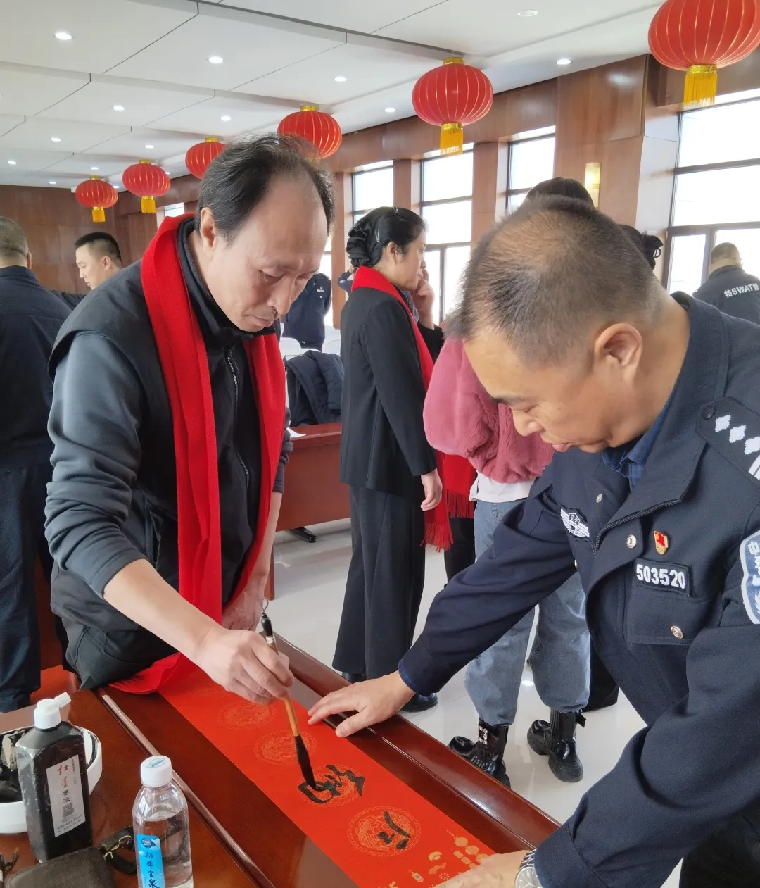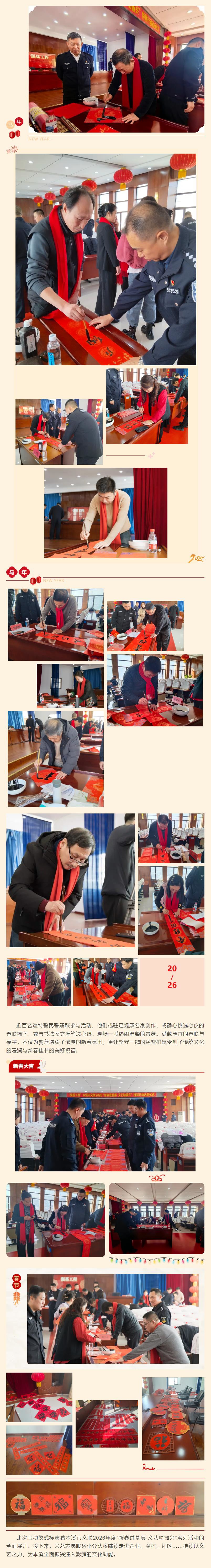 1月20日上午,“强基工程”本溪市文联2026“新春进基层 文艺助振兴”特别行动启动仪式暨本溪市书法家协会“2026丙午马年‘万福迎春’公益活动”在市公安局巡特警支队举行。巡特警队员、民警代表与我市文艺工作者齐聚警营,以笔墨共迎新春,以艺术传递温情,在浓浓墨香与融融暖意中,共同铺展出一幅警民同心、文化育人的生动画卷。