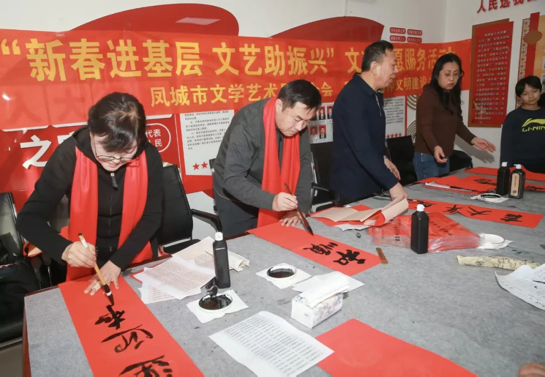 新春之际,凤城市文联开展“新春进基层 文艺助振兴”文艺志愿服务活动,组织百余名文艺志愿者,深入香铺社区、绸厂社区、吉祥社区、刘家河镇、边门镇、机关大院等基层一线,开展形式多样的惠民服务。活动涵盖送春联福字、非遗体验、公益摄影等内容,目前共赠送春联福字3000余副。