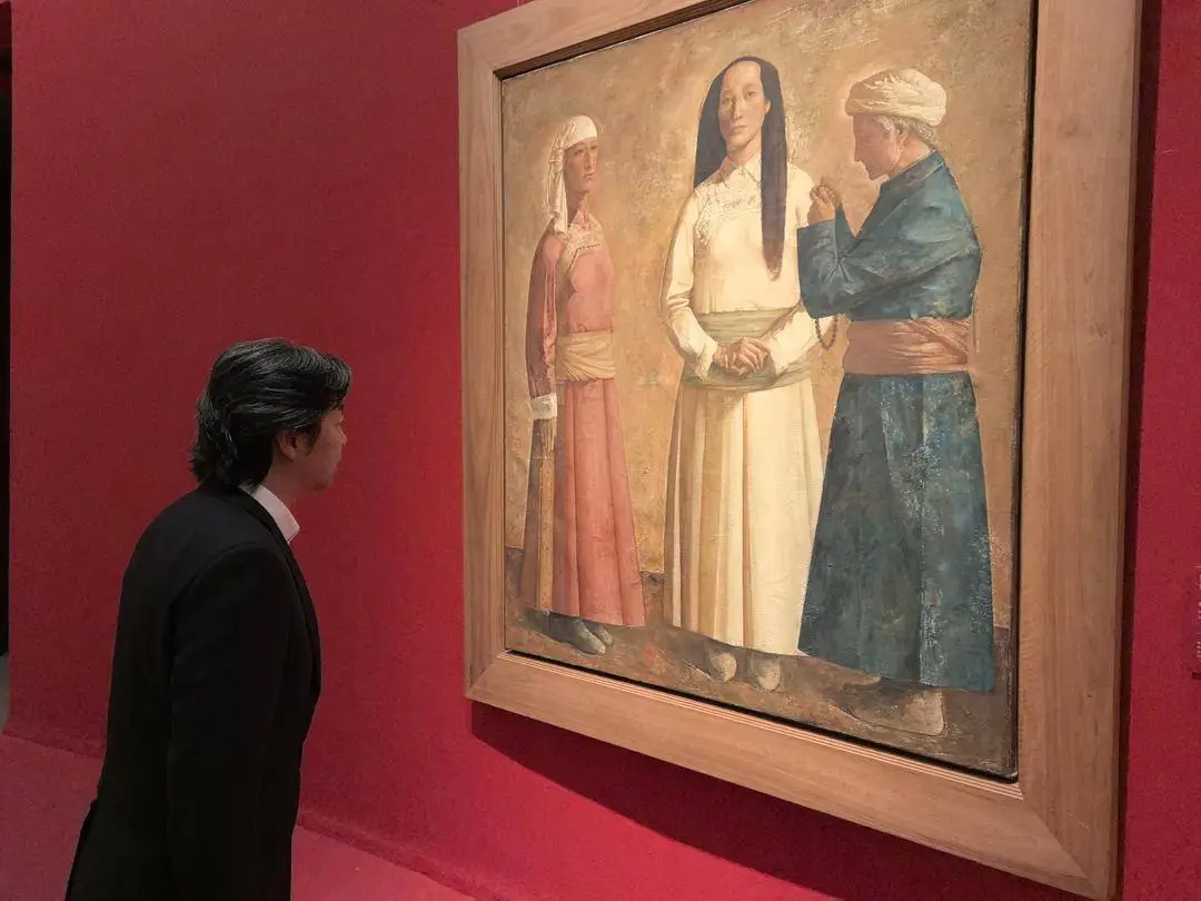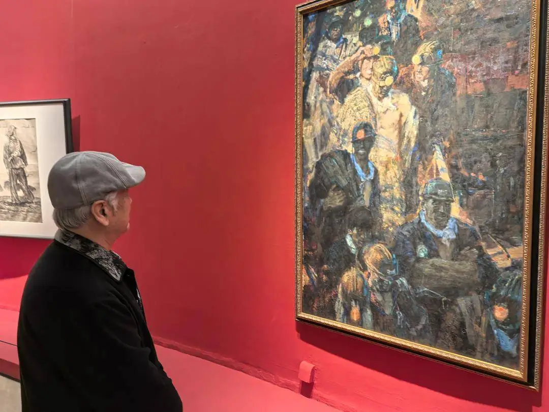 在王盛烈作品《海风》前,其子王铁牛久久伫立。这幅作品以质朴动人的笔触,传递出对革命精神与人文情怀的延续。“父亲始终关注生活、刻画人性,”王铁牛说。他的参展作品《1959——大庆石油会战》,正是对父亲现实主义创作风格的继承与发光大。
