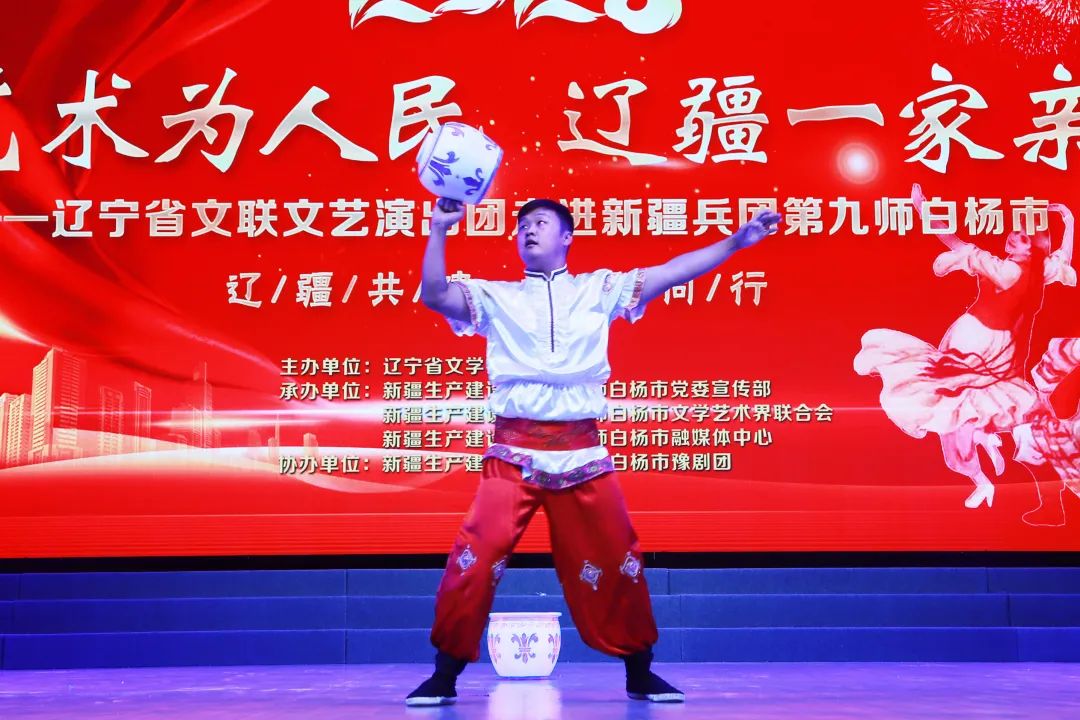 杂技《顶花坛》 表演者:姜正闯 辽宁省文联作为中国文联文化润疆、文艺援藏协作机制单位及辽宁省统一战线工作领导小组成员单位,坚持深入贯彻落实习近平总书记关于加强和改进民族工作的重要思想,深刻认识新疆工作在党和国家工作全局中的特殊重要地位,立足文联专业优势和组织优势,高起点谋划文化润疆活动项目,引导推动深扎调研创作、举办创作成果展演展示、开展文艺志愿服务等活动,以润物无声的文化力量,加强了民族团结、增强了文化认同、激发了爱国热情,铸牢中华民族共同体意识。接下来,辽宁的艺术家们将继续走进塔城地区、兵团八师,为当地群众、官兵献上多场文艺志愿服务演出,共同书写新时代新征程辽疆两地心手相牵的美好篇章。