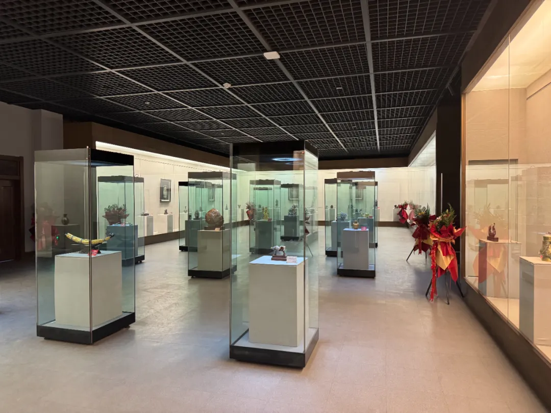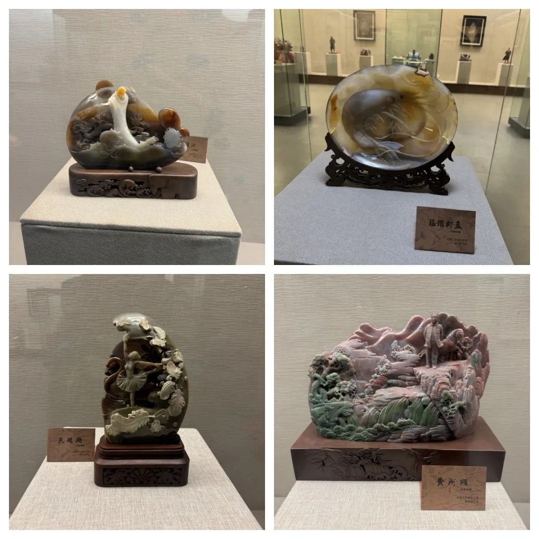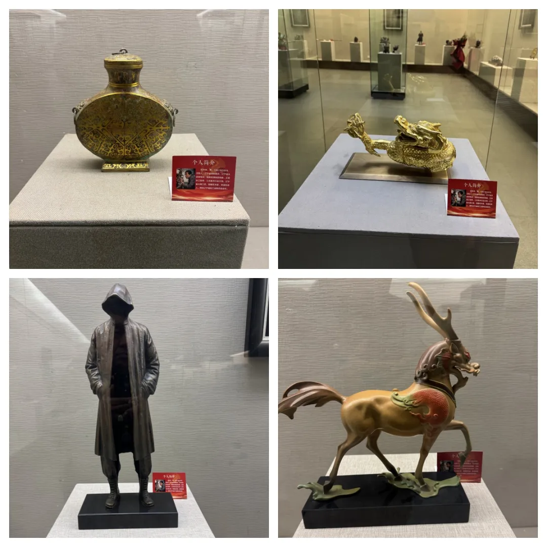 展厅陈设 展览展出了中国工美行业艺术大师、铜雕大师石洪祥,中国工艺美术大师、中国玉石雕刻大师杨克全两位大师的62件作品,展现了炽热的锻铜与亿万年的玛瑙在艺术大师指尖的碰撞与对话。整个展厅光线明亮柔和,布置错落有致,展陈中从纹理细腻入微的仿古铜器到巧夺天工的素活雕刻,从深邃神秘的人物铜塑到晶莹剔透的俏色雕刻,从光泽醇厚的铜雕《瑞兽》到的色彩斑斓的玛瑙雕刻《黄河颂》……每一件作品都展现着两位大师独特的创意和精湛的工艺,散发着浓浓的艺术气息。两类作品互相映衬,相得益彰,将铜雕的刚柔并济之韵与玛瑙雕的逸趣天成之美展现得淋漓尽致,让观众仿佛置身于一个充满诗意与想象的艺术世界。