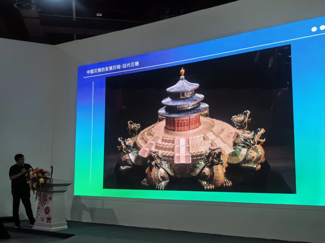 作为本届展览的“重头戏”,“新生活·新民艺——中国民间工艺精品邀请展”汇集了全国各地50位民间工艺家的247件作品,其中设立的“繁花竞放——历届山花奖获奖作者作品展”特别单元,集中展出了22位中国民间文艺山花奖获奖者的93件精品力作,一定程度上反映了中国当代民间工艺创作的高超水准。我省第十六届中国民间山花奖获得者金吉受邀携《貔貅》《金龙献瑞》两件作品参展,并以《新时代民间文艺的可持续发展——以大连贝雕为例》为题参加了“新生活 新民艺”主旨交流。交流中金吉结合自身创作实践,分析了新时代民间工艺发展的新使命与挑战,介绍了大连贝雕的可持续发展路径与实践探索,并就未来民间工艺的多维融合与可持续路径进行了展望。