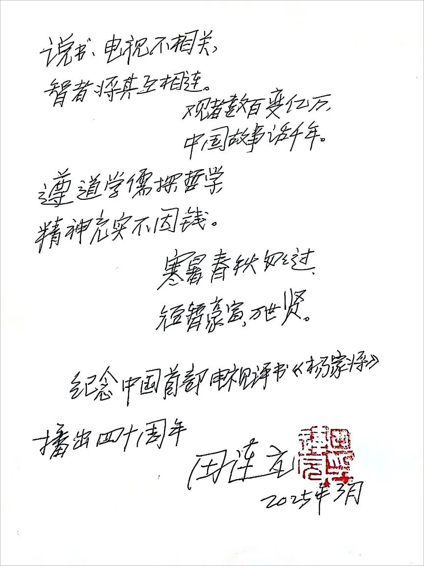 笔者二十多年前曾与田先生合作《杨宗保招亲》,此番再度整理150回电视评书文本,蒙先生信任,特请其在扉页题词,与读者共勉: