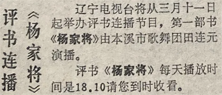 1980年,田连元在本溪电台录制广播评书《杨家将》(102讲,每讲30分钟),1982年荣获辽宁省人民政府文艺奖。1984年岁末,辽宁电视台编导王大海、关成华赴本溪与田连元商讨。编导坦言,电视评书与广播不同,一人枯坐画面易令观众视觉疲劳,故提议每日仅播出5分钟。