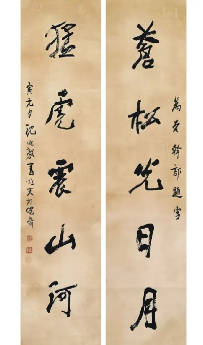 《苍松猛虎联》(纸本 1986年) 93件书法作品则涵盖篆、隶、楷、行、草等书体及篆刻,集中呈现了沈延毅、杨仁恺、聂成文、王丹等辽宁代表性书家、国家级展览获奖作者等的实力。