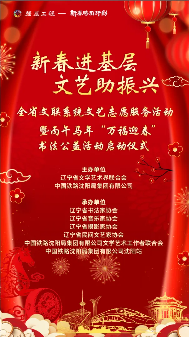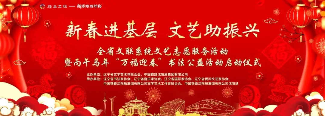为深入贯彻落实中央及省委关于做好2026年元旦春节期间有关工作和中国文联关于组织开展“强基工程”2026新春特别行动的通知要求,辽宁省文学艺术界联合会和中国铁路沈阳局集团有限公司共同主办的2026年“新春进基层 文艺助振兴”全省文联系统文艺志愿服务活动暨丙午马年“万福迎春”书法公益活动启动仪式即将在沈阳站二层候车大厅举行。