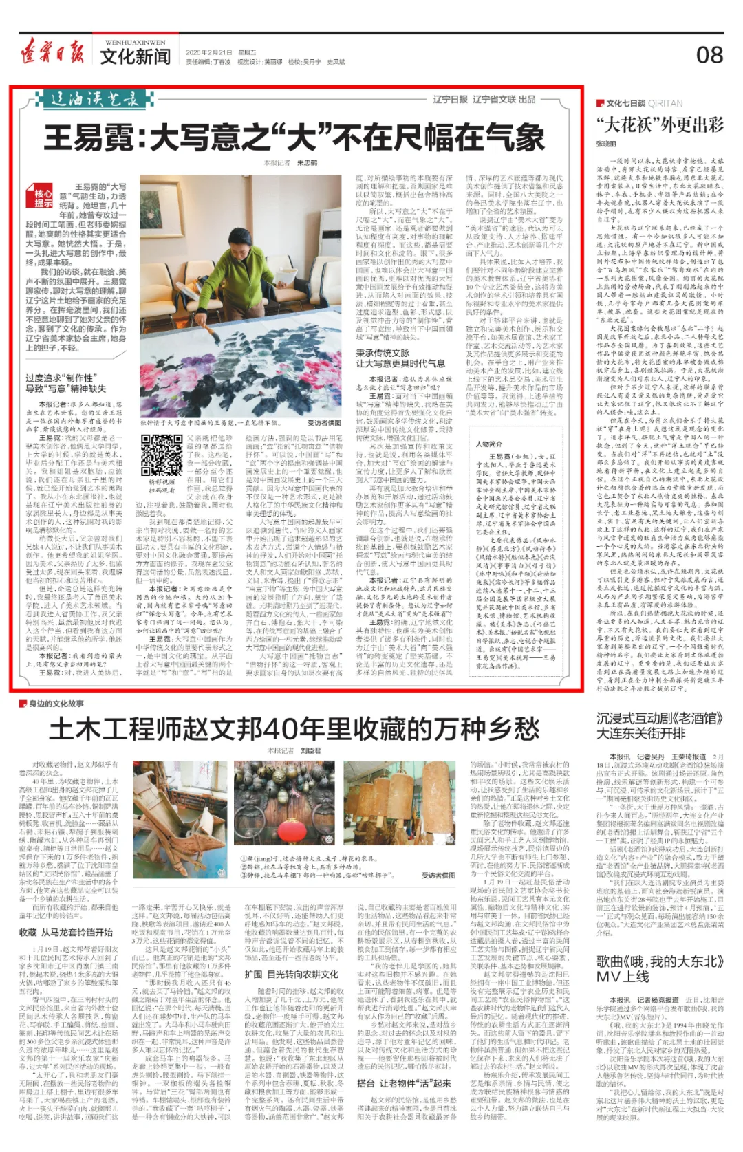 我们的访谈,就在融洽、笑声不断的氛围中展开。王易霓聊家传,聊对大写意的理解,聊辽宁这片土地给予画家的充足养分。在挥毫泼墨间,我们还不经意地聊到了她对父亲的怀念,聊到了文化的传承。作为辽宁省美术家协会主席,她身上的担子,不轻。